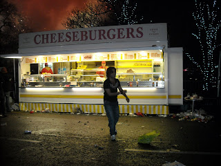 Guy dancing his way to cheeseburgers.
